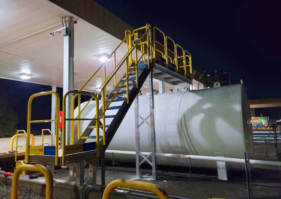 This ErectaStep stair installation provides workers access to the top of a diesel gas tank located inside a facility.