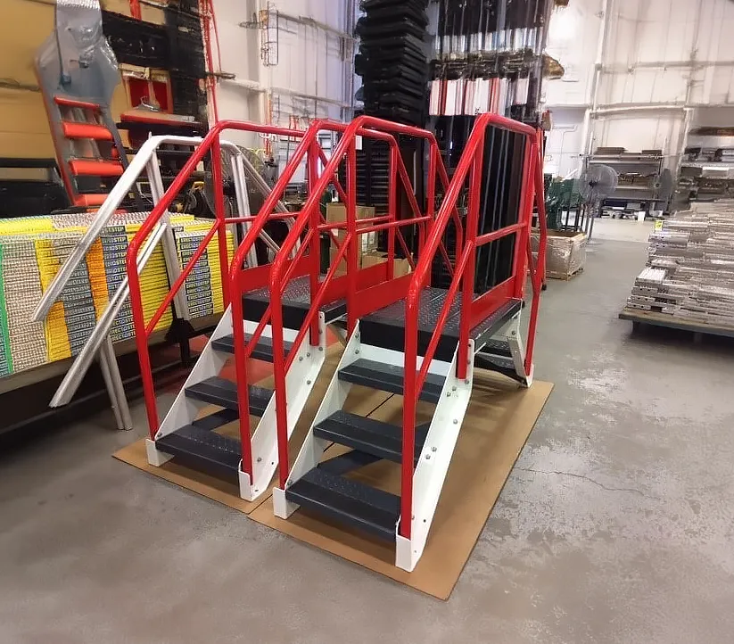 ErectaStep provided a solution that utilized platforms 3 inches less than the standard size, but were as sturdy as the 6-inch variety and stayed within compliance. Along with the custom platform height, the automobile manufacturer also wanted color-specific powder coating of the entire crossover ladder, platform, and handrails. We also added non-slip tape on the stair treads and leading edges based on the organization’s preference. Single handrail sections were used to span across the platform and stairs to ensure safety and stability on the reduced work platform height.