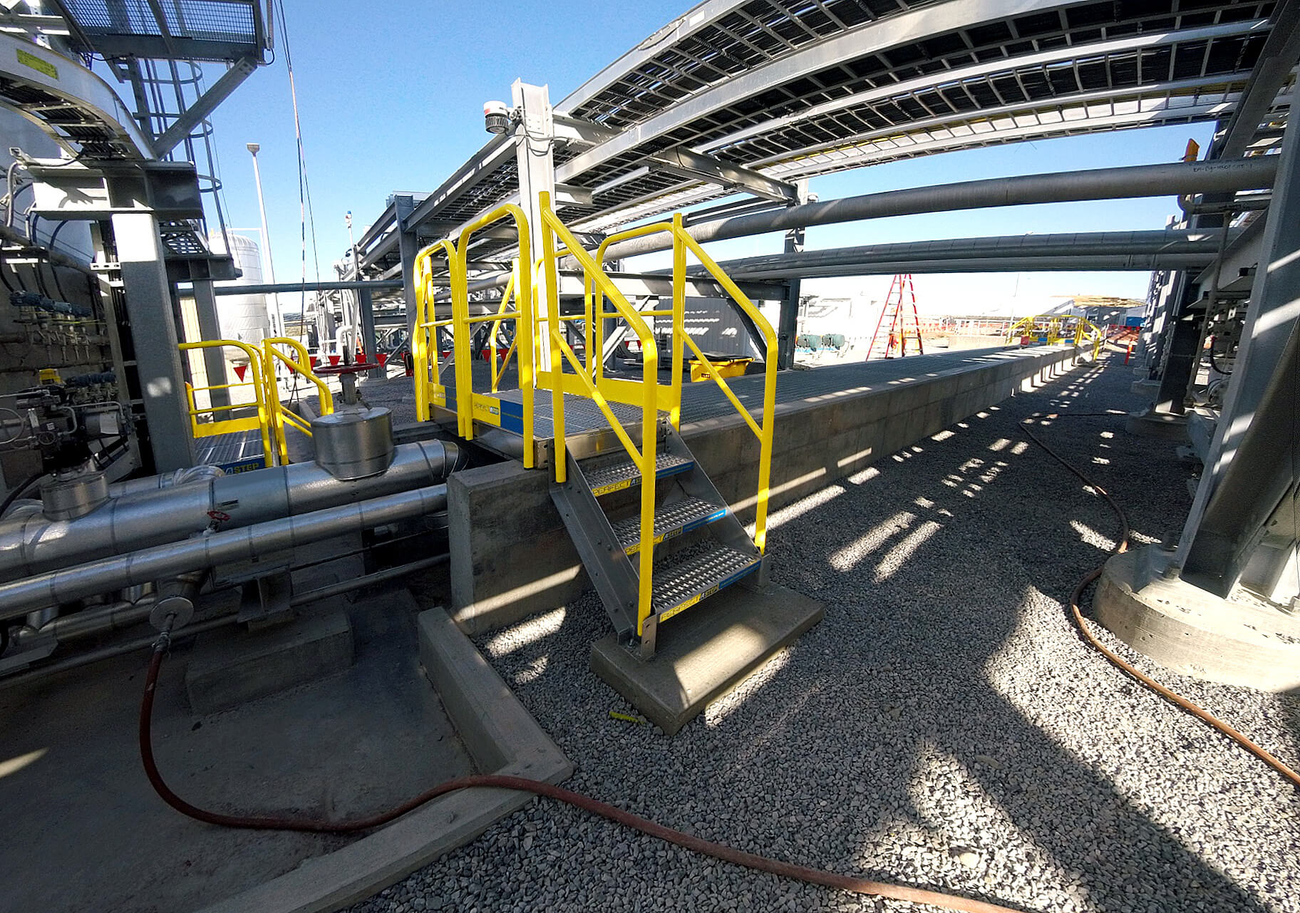 This crossover stair gets workers over electric cables to access electrical equipment at a food and agriculture facility located in Idaho