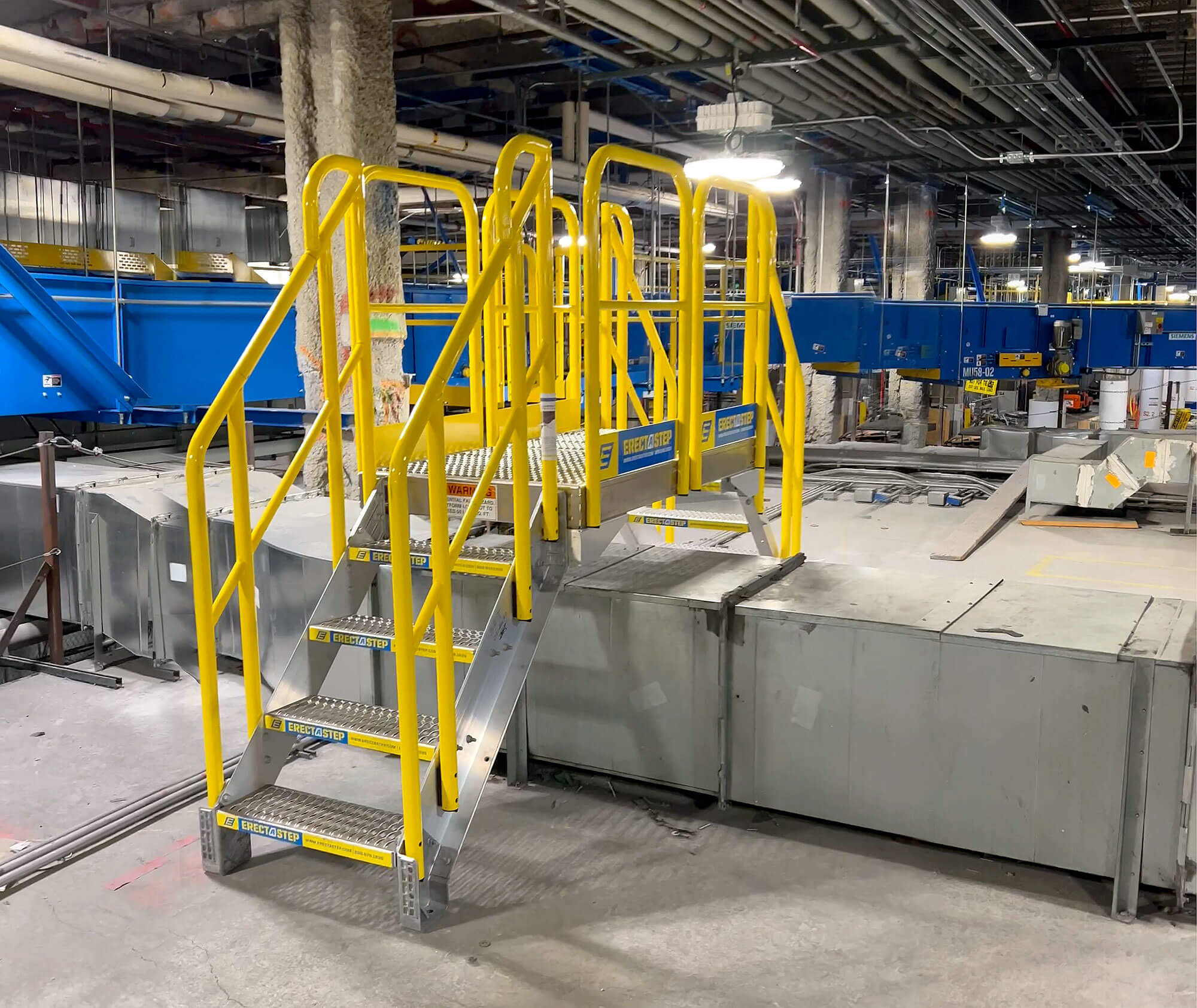 Erectastep 3-step industrial crossover stairs with platform over pipes.