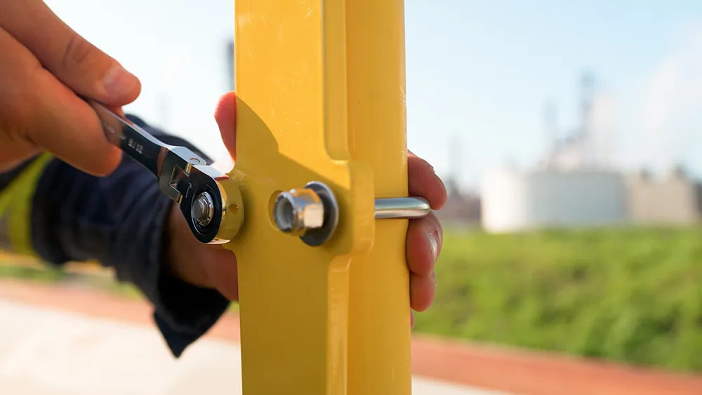 The slogan “One Gate. Fits All. Stops Falls.” encapsulates the brand’s commitment to providing safety solutions that can be adapted to various needs and settings, emphasizing their focus on preventing falls in industrial areas.